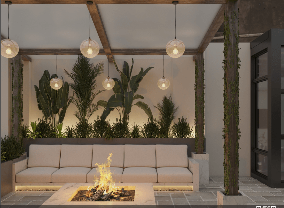 Hardscape, Is a construction that defines outdoor spaces in the same way that planting beautifies outdoor space, installation of garden tiles, playground, water features, garden lighting, wooden pergolas, outdoor kitchens and outdoor fireplace